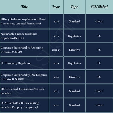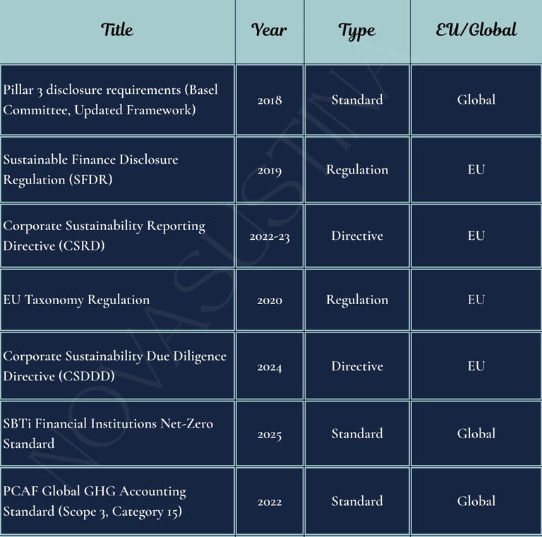 Other notable standards that may be applicable include the GRI Standards, IFRS S1 and S2, TCFD, TNFD for nature related disclosures, and UN Principles for Responsible Banking.